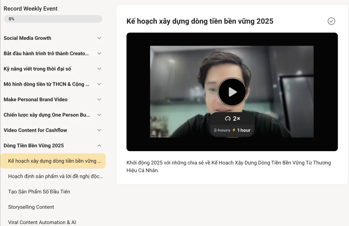 Chương trình được chia thành 10 khoá học cụ thể, đi từ bước nền tảng như tư duy và chuyển hóa tâm trí (Mind Shifting), đến các bước áp dụng thực tế vào kinh doanh, sáng tạo nội dung, và xây dựng thương hiệu cá nhân.